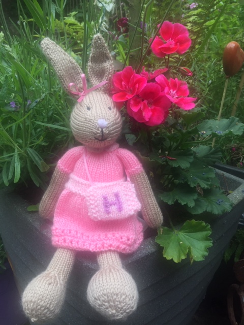 Hannah is a sweet little bunny in a pretty pink dress and matching handbag. She can be personalised with an initial of your choice. €45 plus postage.